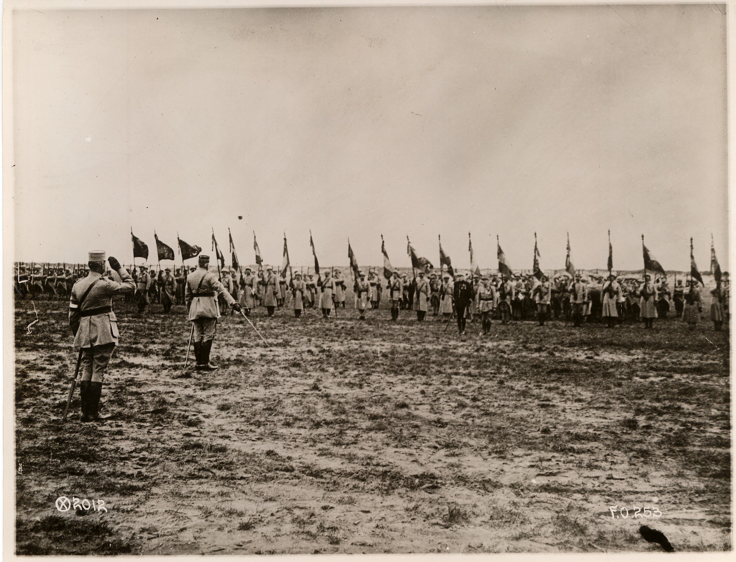 | French soldiers in formation with 20 flag bearers | unknown | 1910s | US Air Corp | NARA Great Lakes | WWI | soldiers | ||