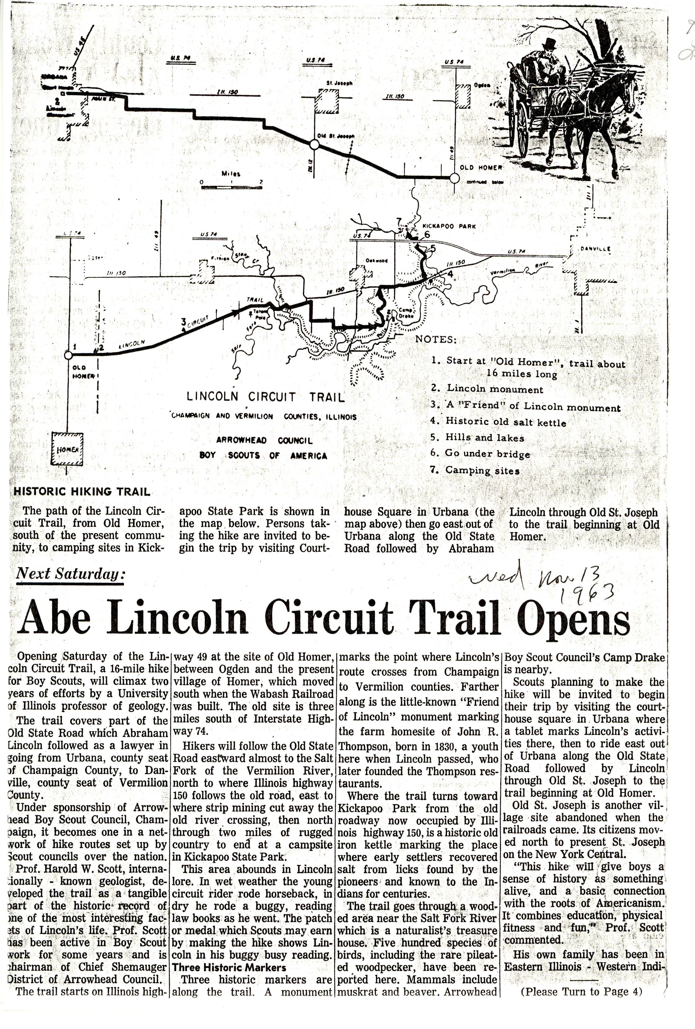 -Newspaper Article, November 13, 1963. This newspaper article gives a map of the 8th Circuit that Lincoln travelled as a lawyer, and highlights the local Boy Scout chapter that worked on the monuments marking the route.