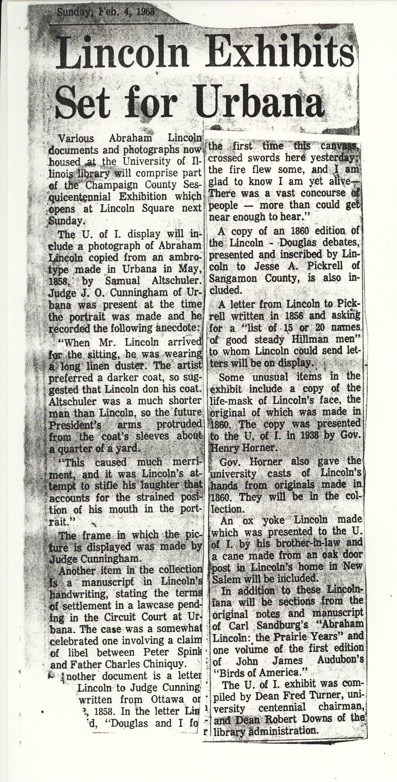 -Newspaper Article, Feb 4, 1968. Outlines a number of Lincoln artifacts housed at the University of Illinois that was on display at a Lincoln celebration.